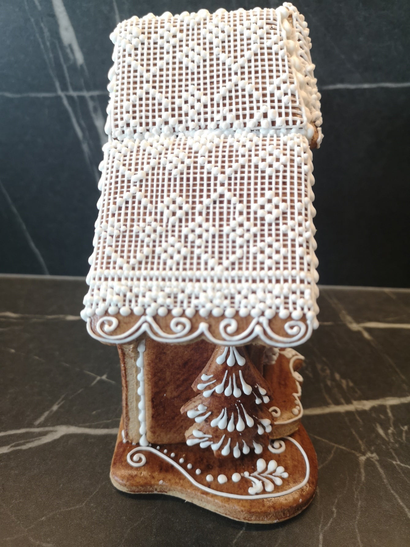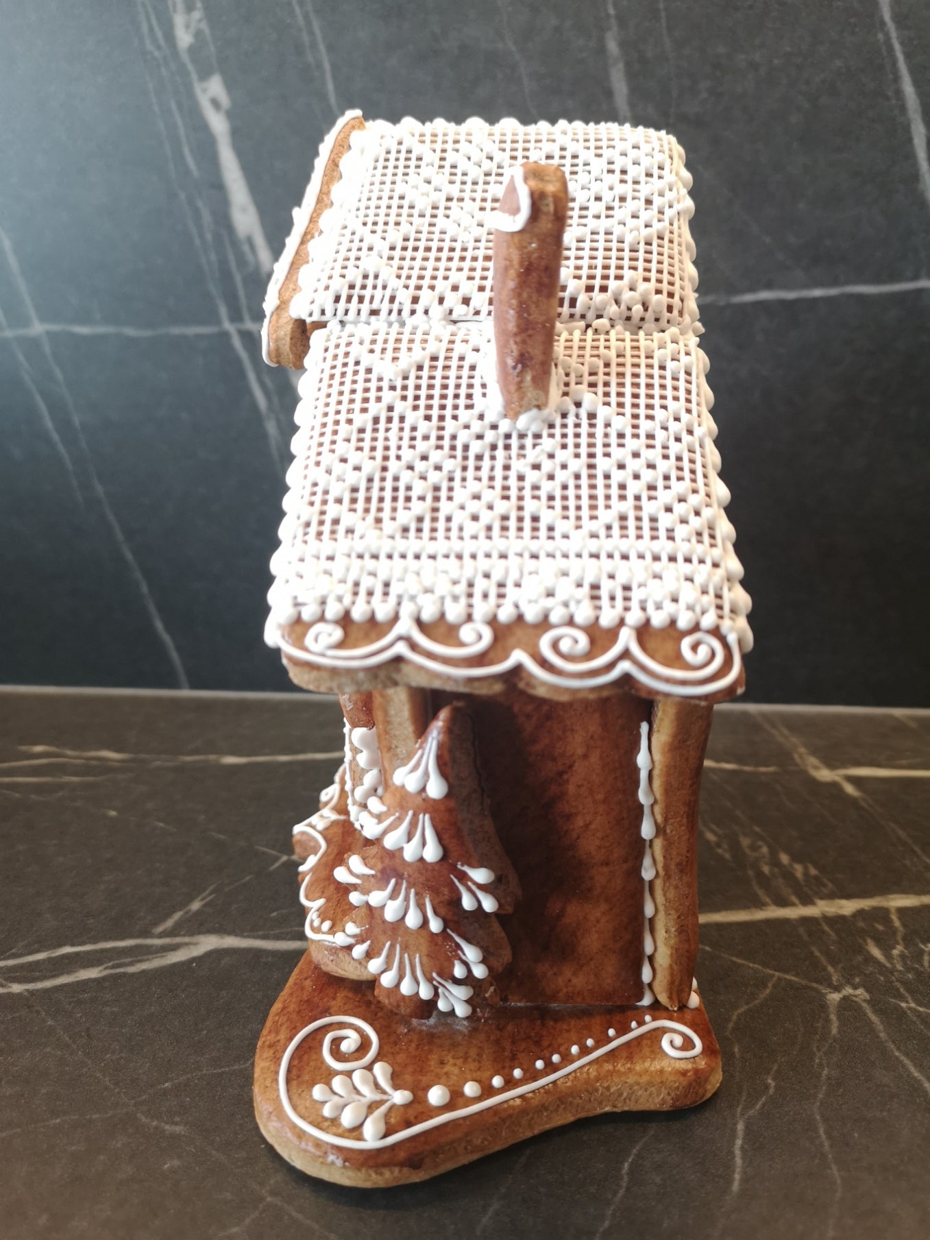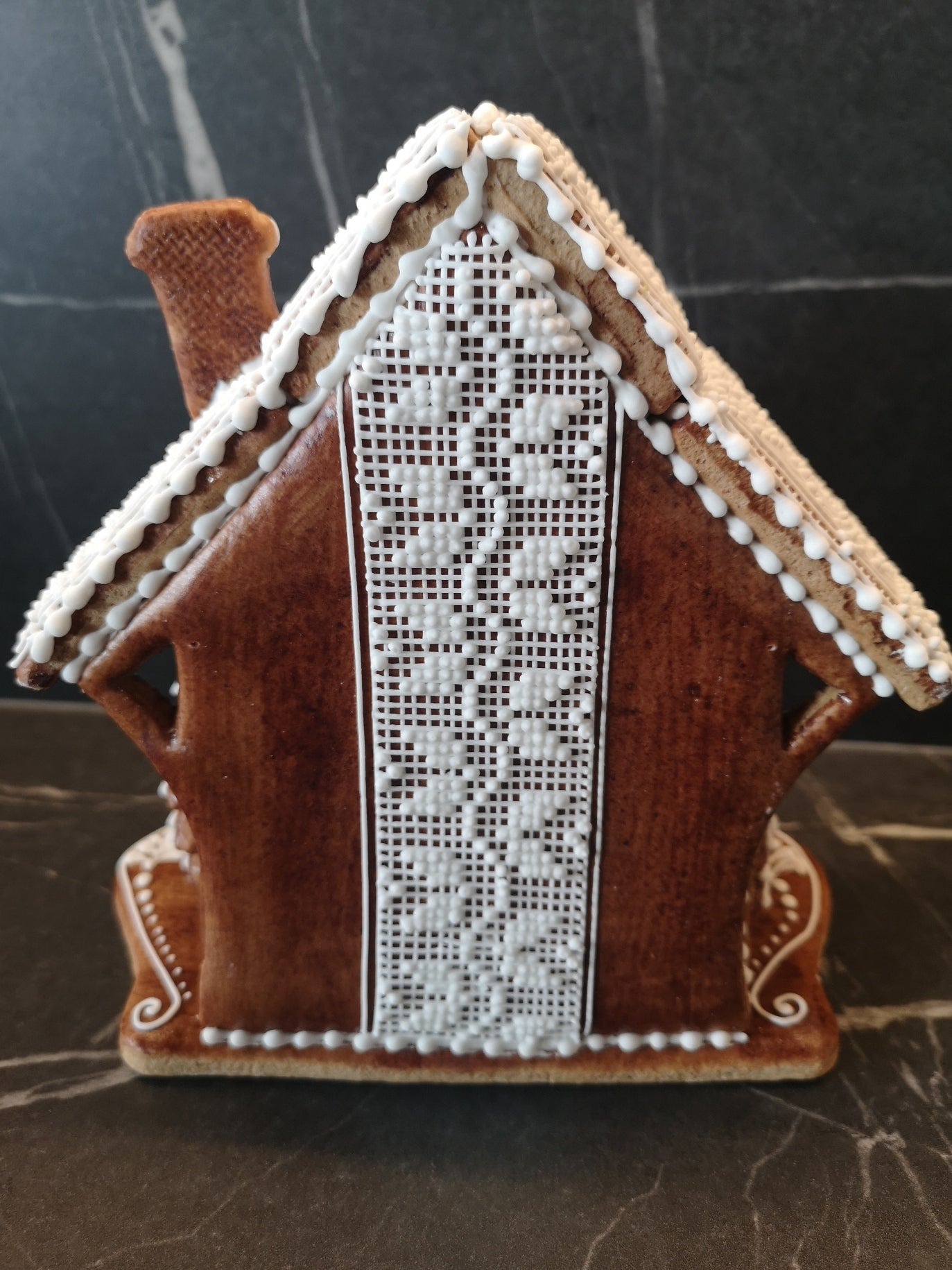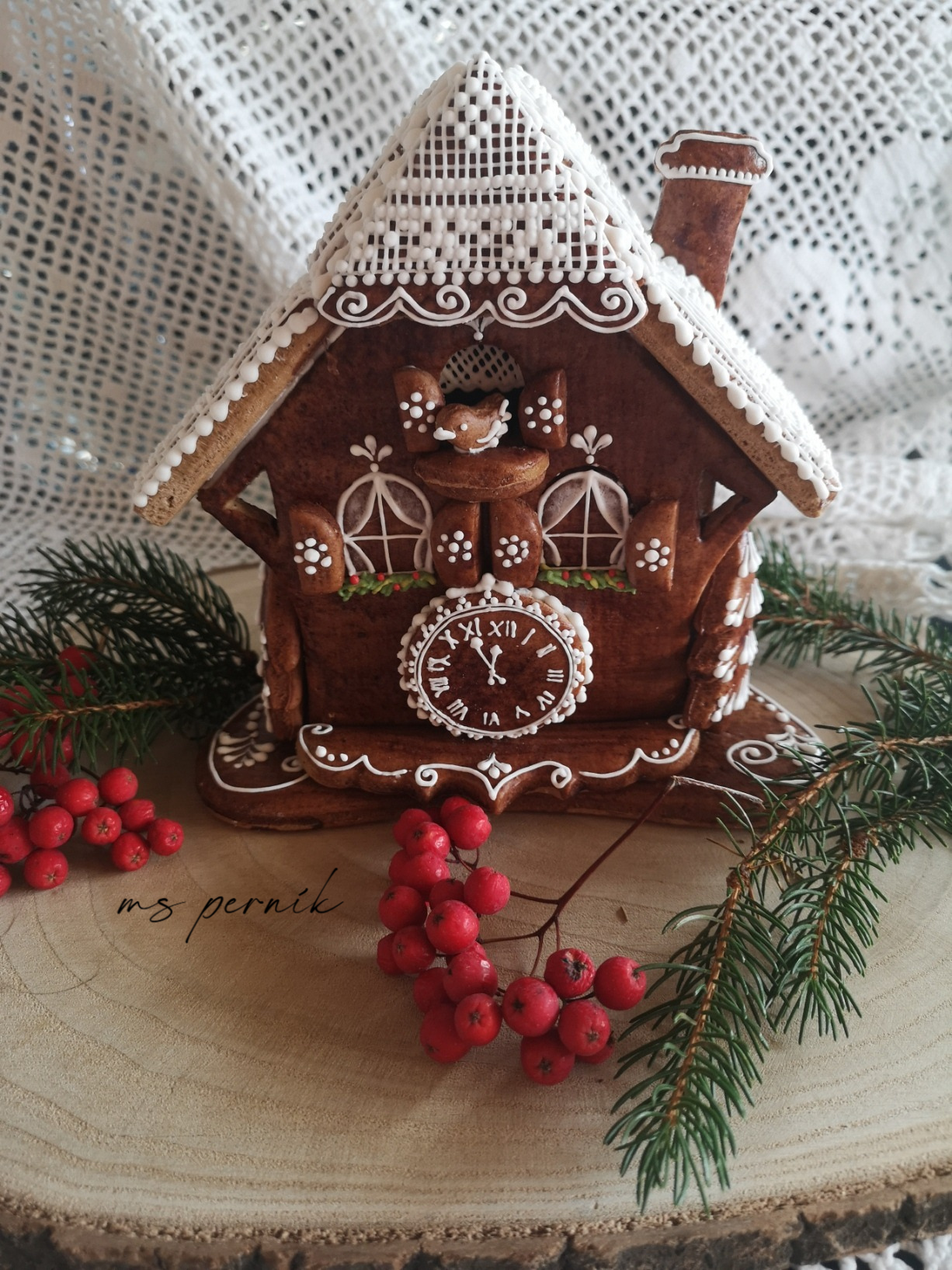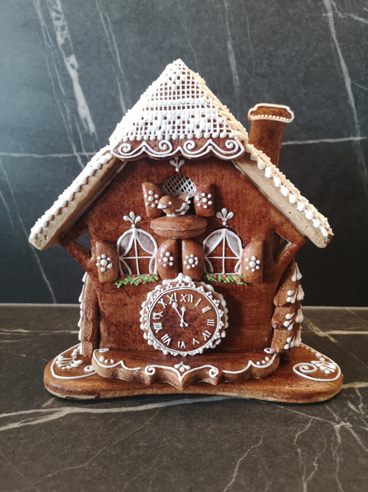 Ručně vyráběný perníkový domeček inspirovaný starými kukačkovými hodinami. Každý kousek je originál, který voní po medu, koření, polevě a Vánocích. Domeček je pečlivě zdoben jemnou bílou polevou do krajkových vzorů, s hodinami a drobnými detaily, které mu dávají kouzlo starých časů.