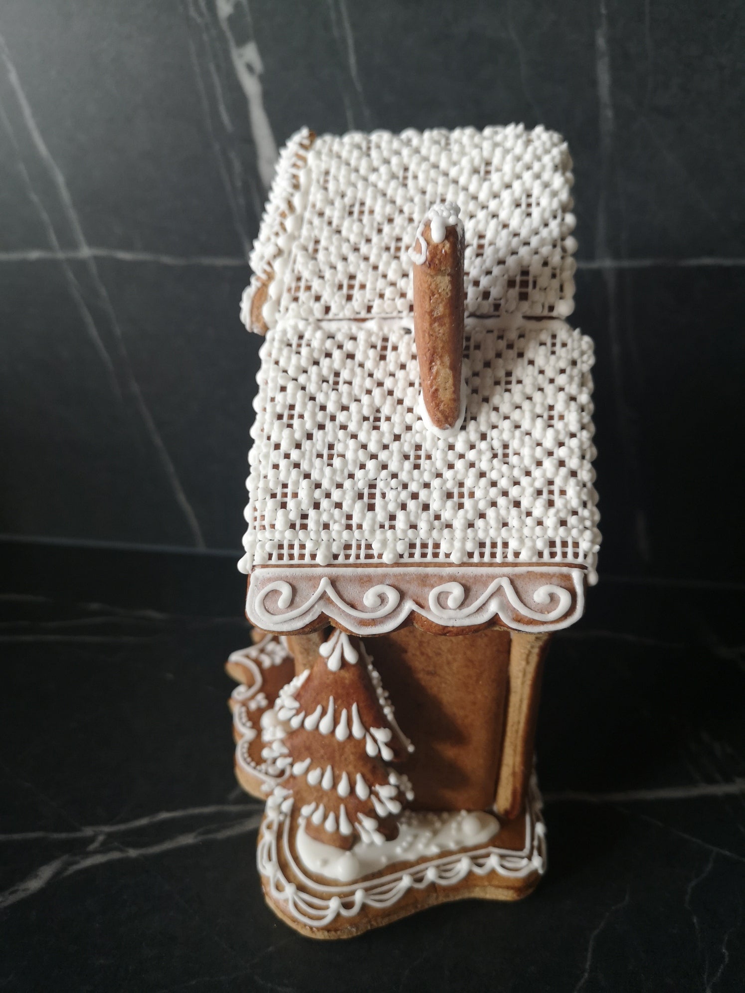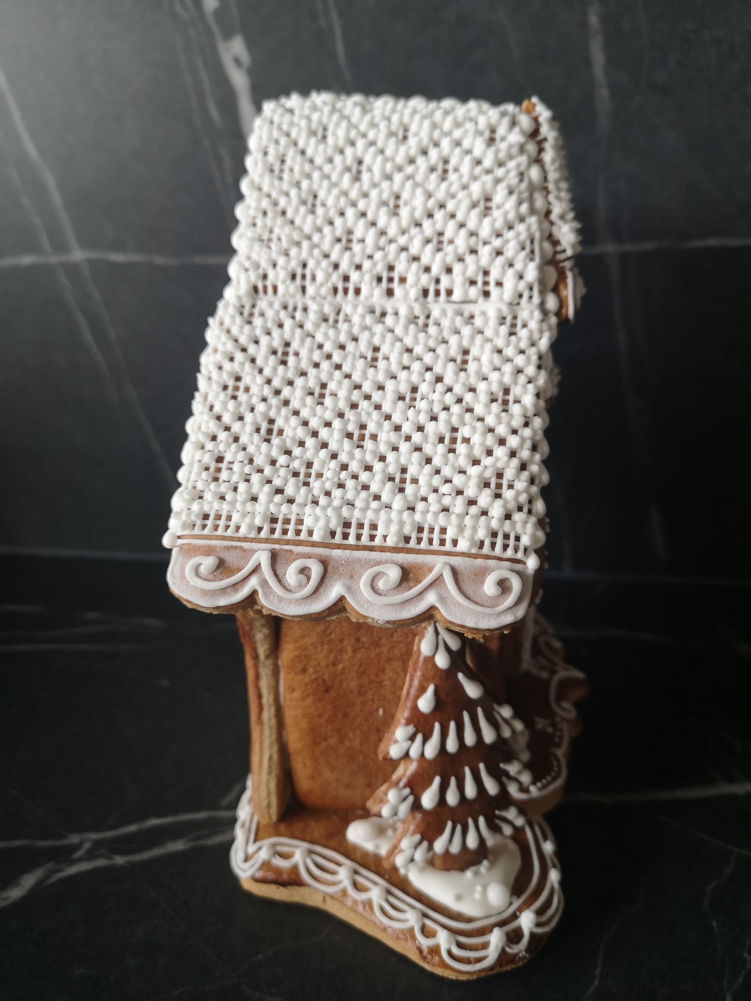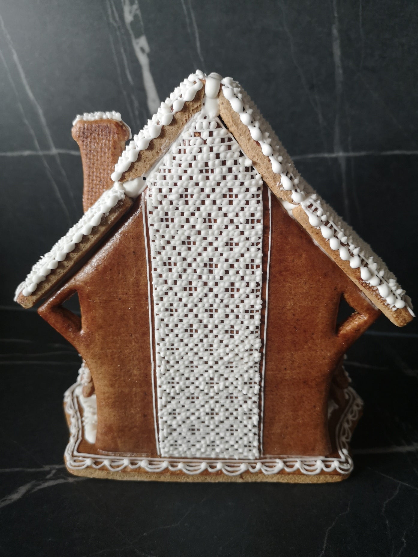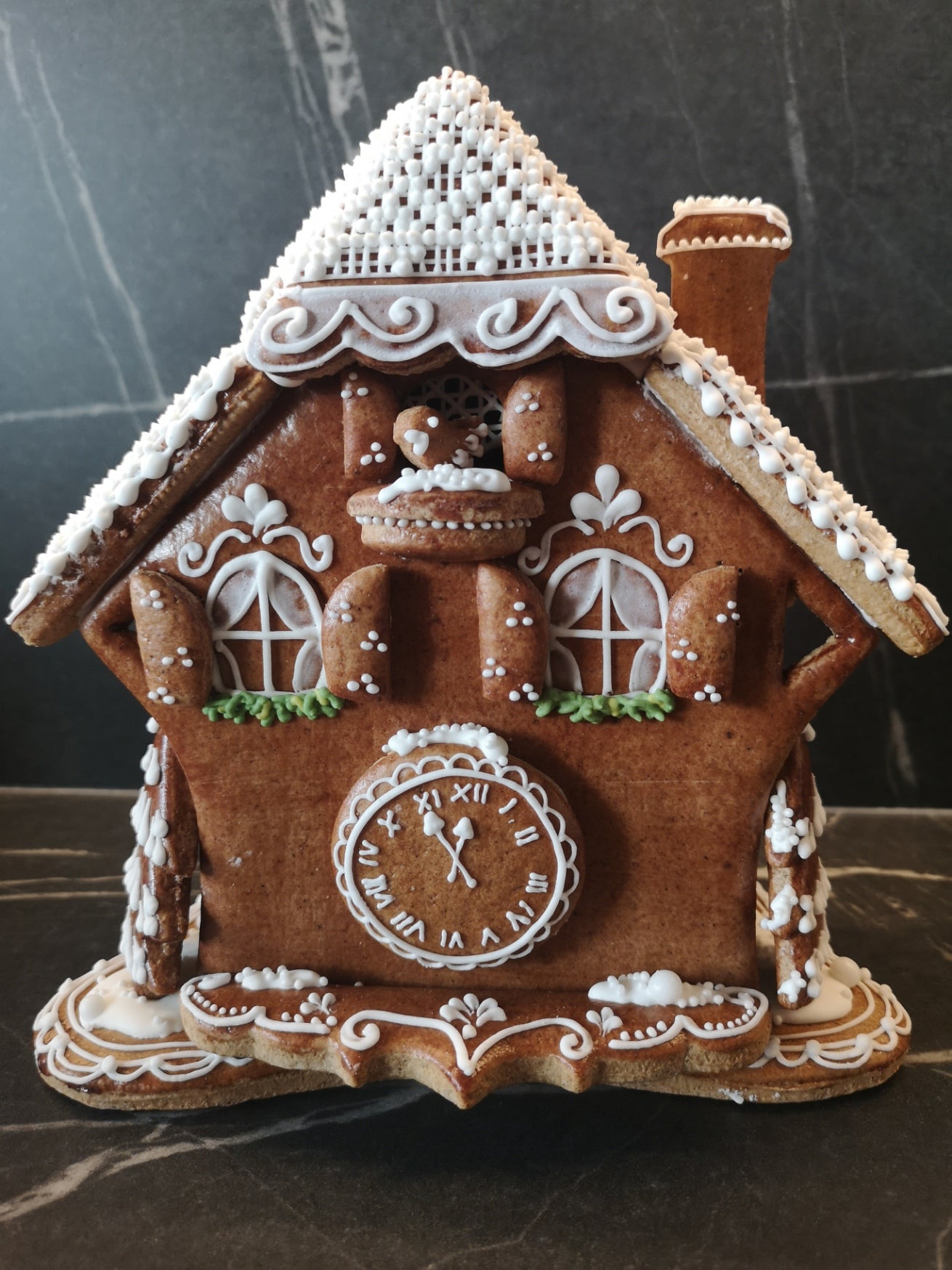 Ručně vyráběný perníkový domeček inspirovaný starými kukačkovými hodinami. Každý kousek je originál, který voní po medu, koření, polevě a Vánocích. Domeček je pečlivě zdoben jemnou bílou polevou do krajkových vzorů, s hodinami a drobnými detaily, které mu dávají kouzlo starých časů.